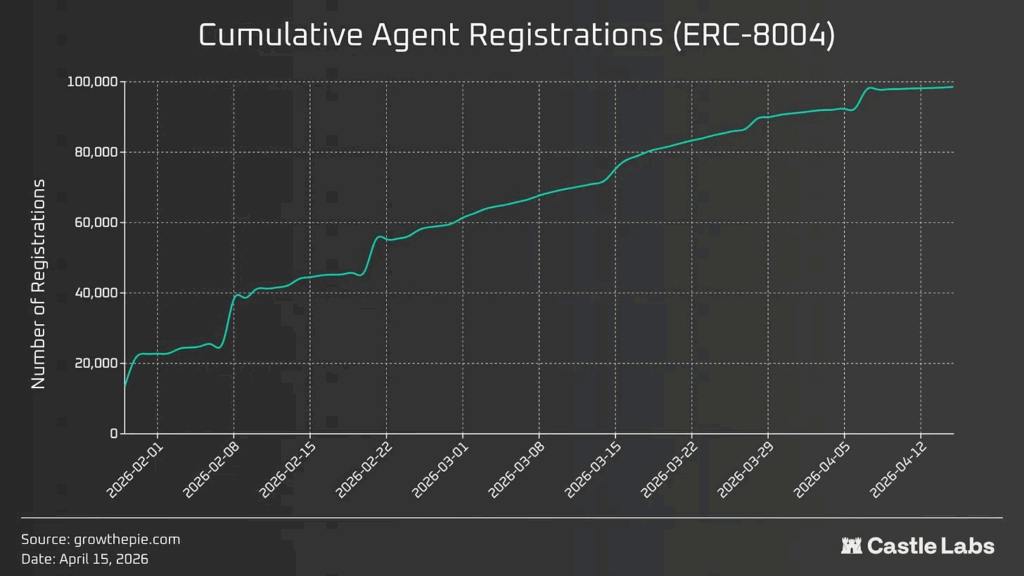 The standards layer is moving the other way. ERC-8004, the agent-identity standard live since late January 2026, has crossed roughly 98,000 registrations across 10+ EVM chains in under three months, on a curve that has stayed remarkably steady. Read together, the two charts mark out the actual signal in the noise. Speculative volume retraces, identity infrastructure compounds. The category is maturing on the rails, not on the headlines.