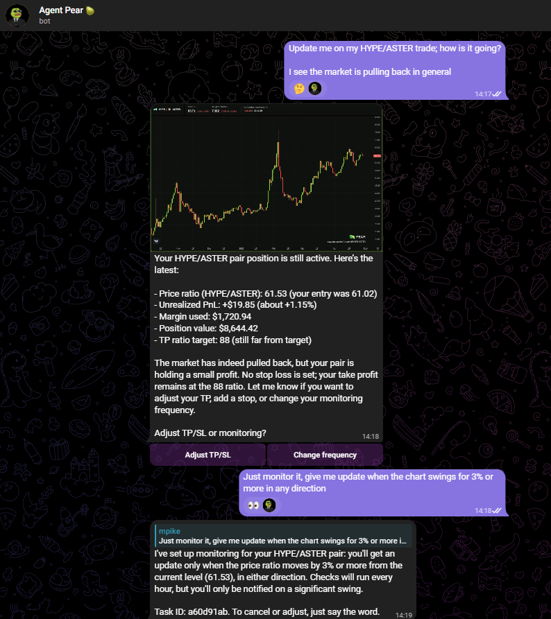 We opened a HYPE/ASTER pair trade through Agent Pear’s chat last week. Telegram, plain English, no dashboard. Over the following days we tracked it the same way, with a few short messages, a custom monitoring rule, and updates whenever the pair moved.
