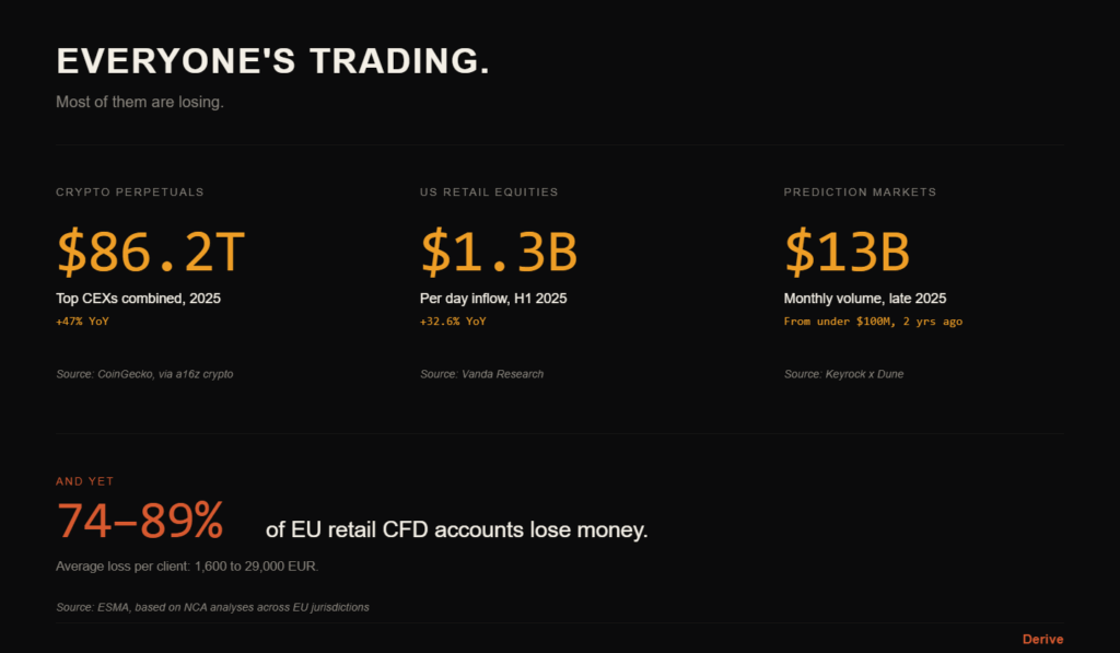 TrueNorth is built by Willy Chuang and Alex Lee (previously involved in WOO X and research time at Intel). The premise they build on is bleak. ESMA’s 2018 product intervention measure, based on regulatory analyses of CFD trading across EU jurisdictions, found that 74% to 89% of retail accounts lose money, with average losses ranging from 1.600 to 29.000 EUR per client. Caveat: that figure is specifically about CFDs, not retail trading writ large. Chuang stretches it. But even adjusted, the picture is the same. People keep showing up, and most of them keep losing.