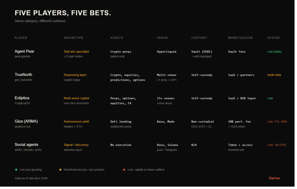 Five players, five different bets on what an agent should be. Pear is the specialist. TrueNorth and Ecliptica are the copilots, approached from opposite directions. Giza is the autonomous-yield benchmark and the cautionary tale at the same time. Social agents sit one layer removed from the rest.