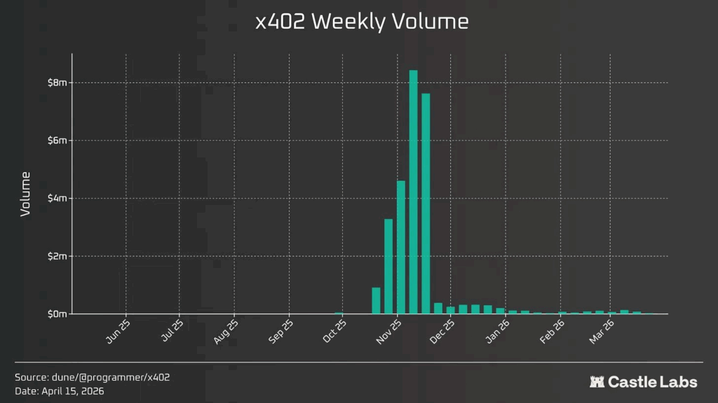 The pattern from Giza is not unique to one product. Coinbase’s x402 payment rails for agent-to-agent transactions peaked at roughly $8M in weekly volume in late November 2025 and have since collapsed to marginal levels, with most weeks now barely registering on the chart. Lifetime volume sits around $48M, almost all of it concentrated in that Q4 spike.